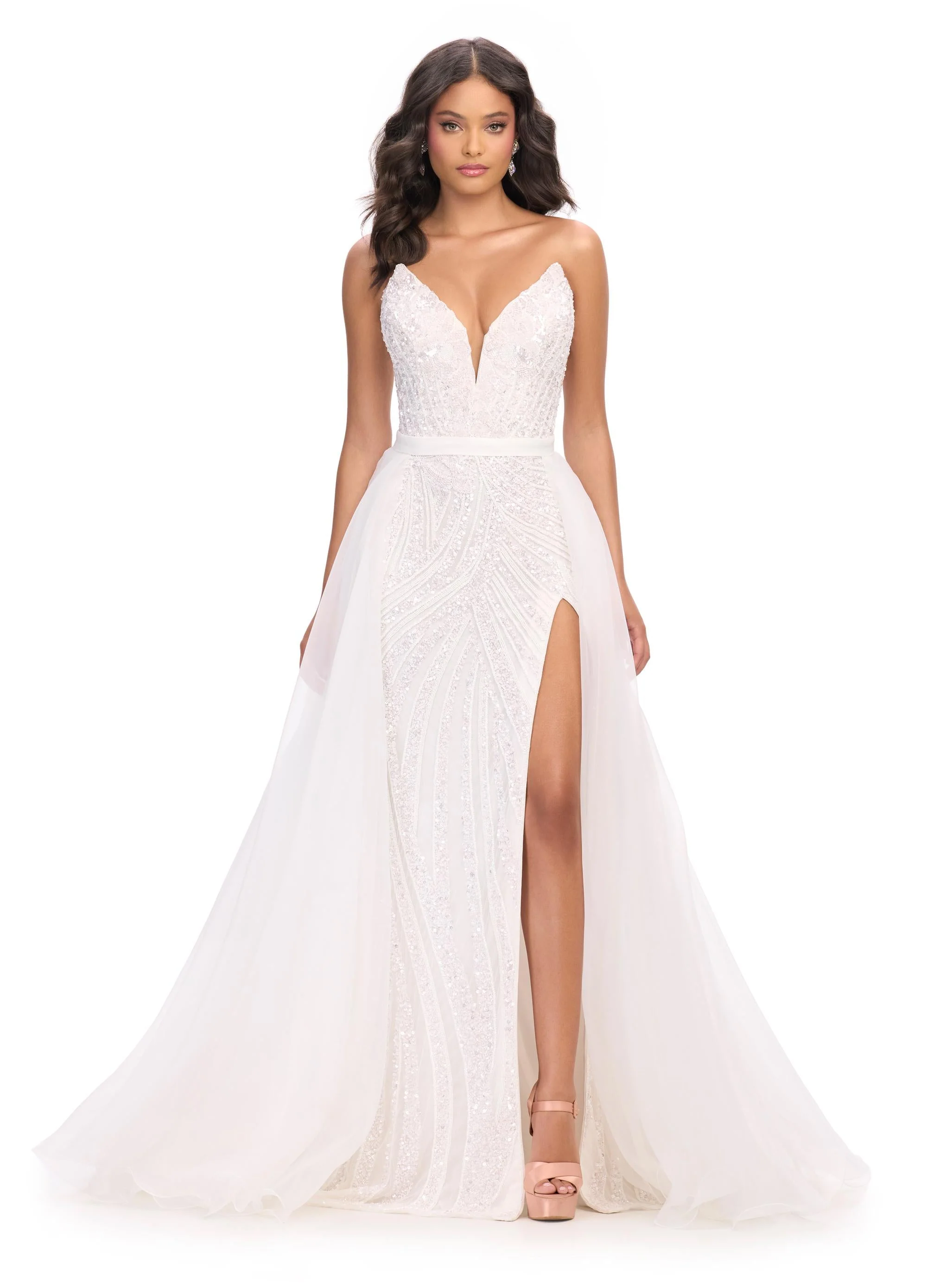 Add extra flair to your favorite dress, romper, bodysuit or jumpsuit with this organza overskirt with wire hem. The skirt is complete with a sweeping train.